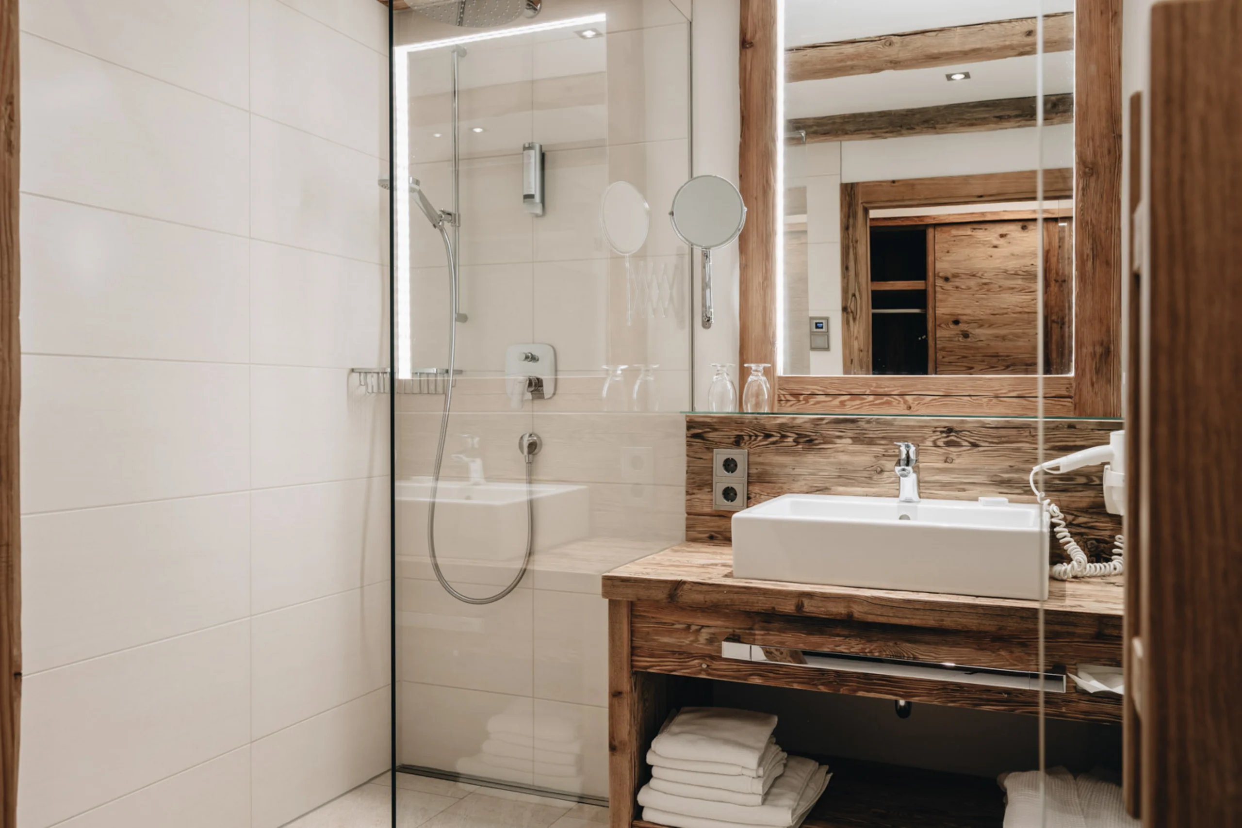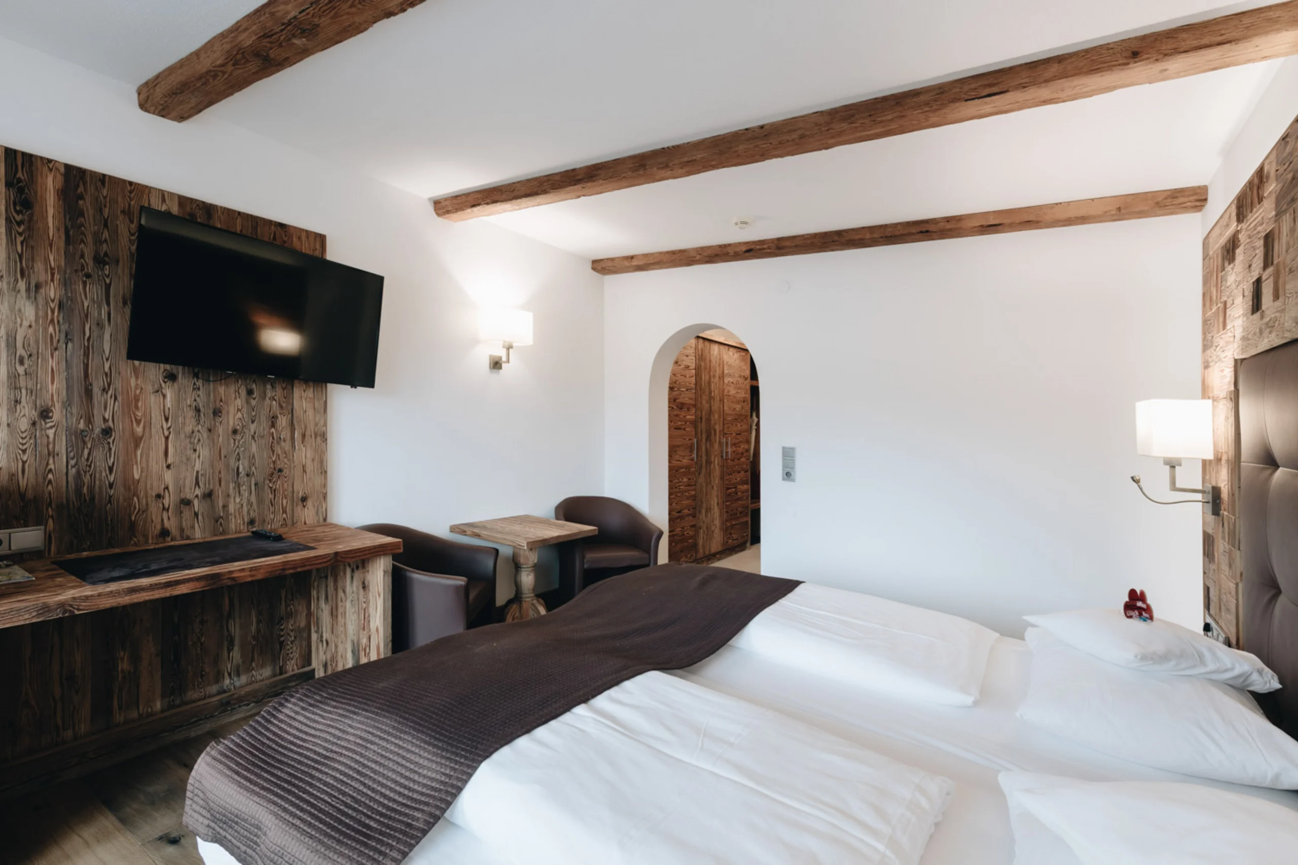 Das Zimmer besticht durch exklusives Tiroler Blockholz, einen Balkon mit Dorfblick und ein Bad mit begehbarer Komfortdusche sowie getrennten WC. Komfortable Extras wie Fön, Kosmetikspiegel, Bademantel, Flat-TV und Zimmersafe sorgen für ein rundum gemütliches Wohnerlebnis.