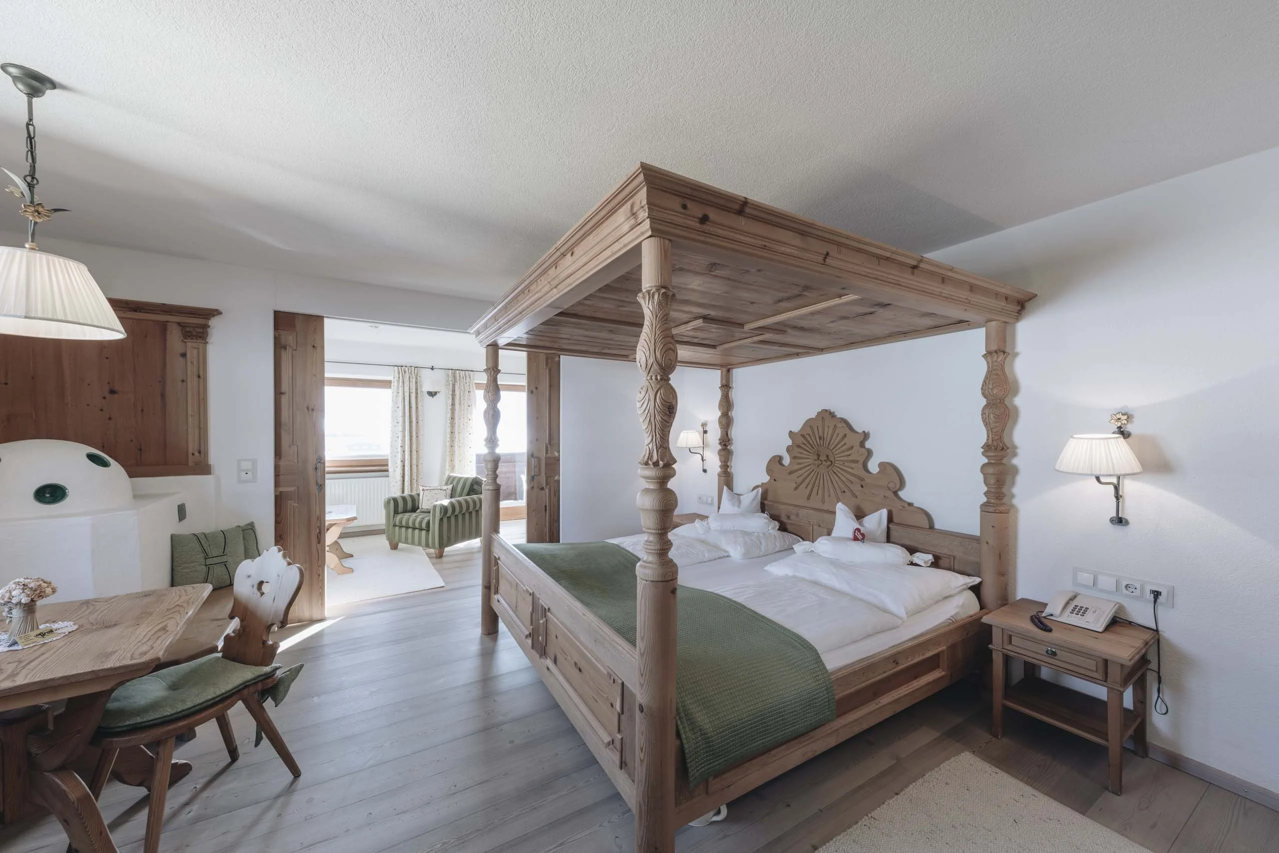 In der Tiroler Suite trifft Tradition auf Wohlfühlkomfort: Altes Fichtenholz aus rund 200 Jahre alten Stuben, ein originales Himmelbett und ein Kachelofen schaffen eine warme gemütliche Atmosphäre. Wohnzimmer und Schlafzimmer sind durch eine Schiebetüre getrennt, ergänzt durch ein Bauerntischerl und ein Schnapskastl für kleine Genüsse. Der Balkon bietet einen herrlichen Blick zum Kaisergebirge.