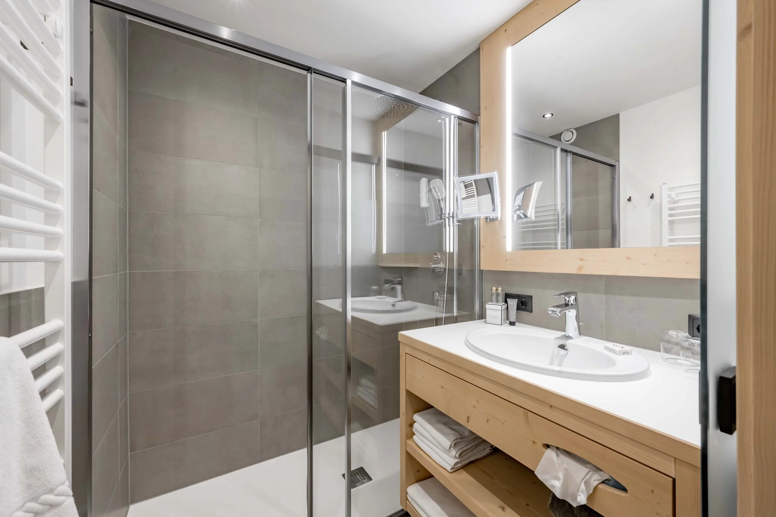 Ein französischer Balkon öffnet den Blick ins Grüne, während das warme Zirbenholz für eine gemütliche Atmosphäre sorgt. Das Zimmer verfügt über einen Wohn- und Schlafraum sowie ein separates Kinderzimmer mit Stockbetten. Das Bad bietet Badewanne, Komfortdusche und Doppelwaschtisch, dazu ein getrenntes WC. Praktische Extras wie Fön, Kosmetikspiegel, Bademantel, 2 Flat-TVs, Zimmersafe und Kühlschrank machen den Aufenthalt rundum komfortabel.